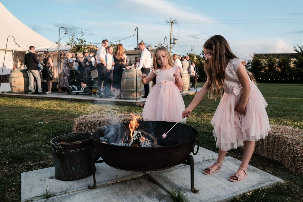 Being a working arable farm, Willow Grange added a rustic character to the day with gorgeous views over the Fenland countryside. Gemma and Julian wanted their wedding to feel down-to-earth and relaxed and the farm provided the perfect backdrop for just that. The main venue in their elegant Sperry tent was surrounded by a courtyard with firepit, farmhouse tables, shepherds’ huts, glamping tents and an oak pergoda for the ceremony – all providing an easy-going, outdoors setting. Their summer wedding vibe was bright and colourful, and the earthy colour palette with splashes of pink beautifully complemented the setting.